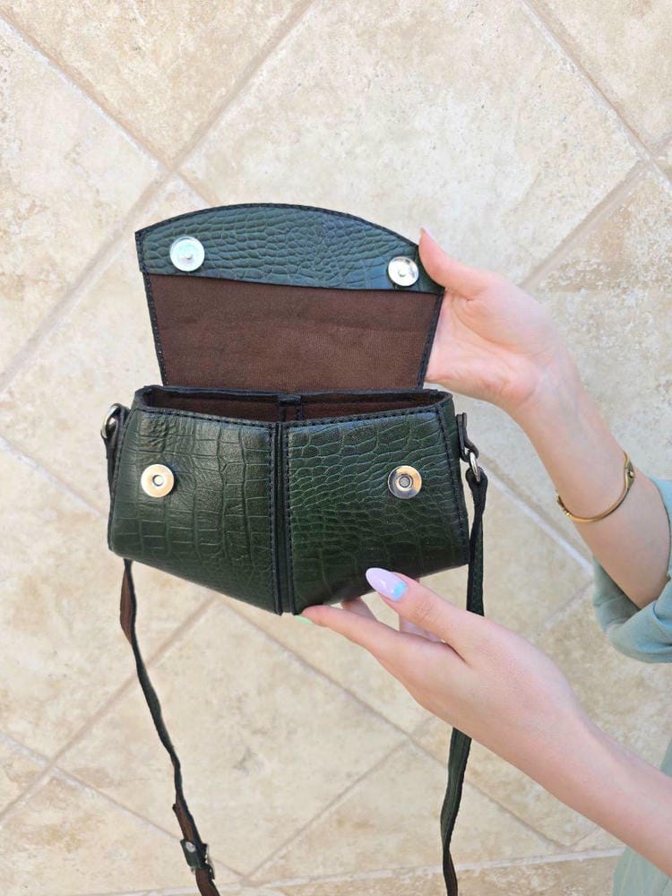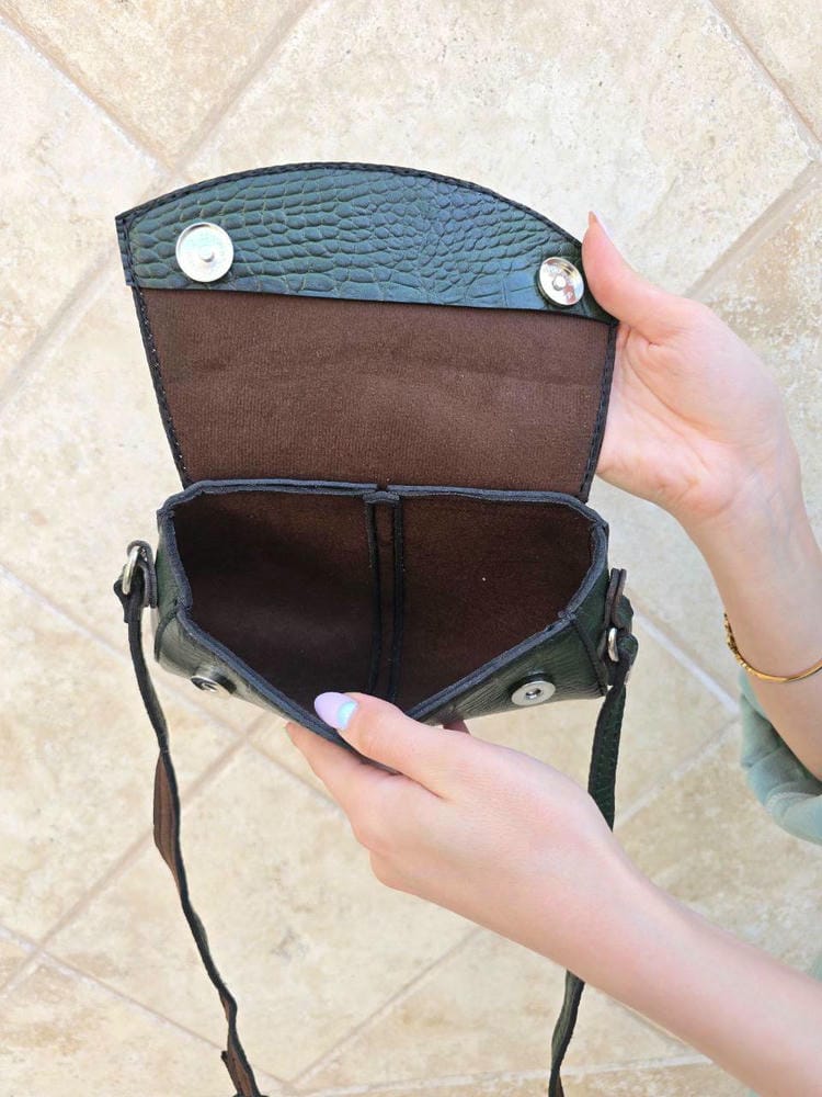 بند چرمی دوشی داره که پشتش آستر خورده ،کیف با درب دکمه خورد باز و بسته میشه و داخلشم آستر دوزی شده.