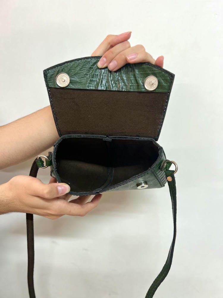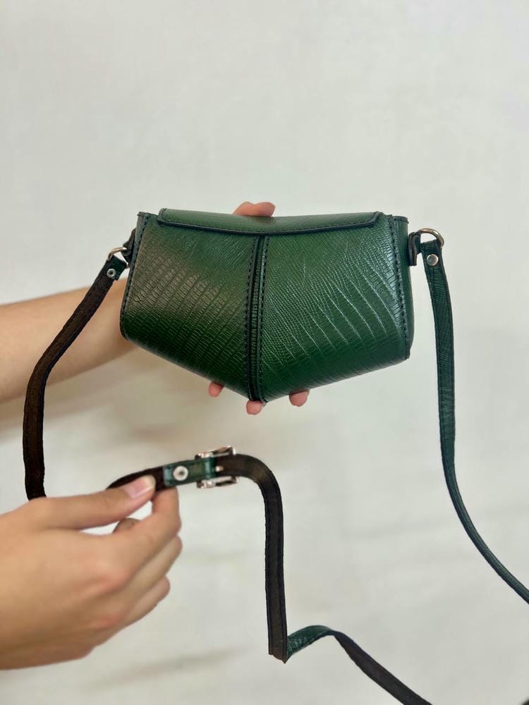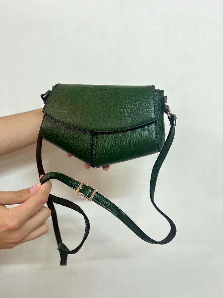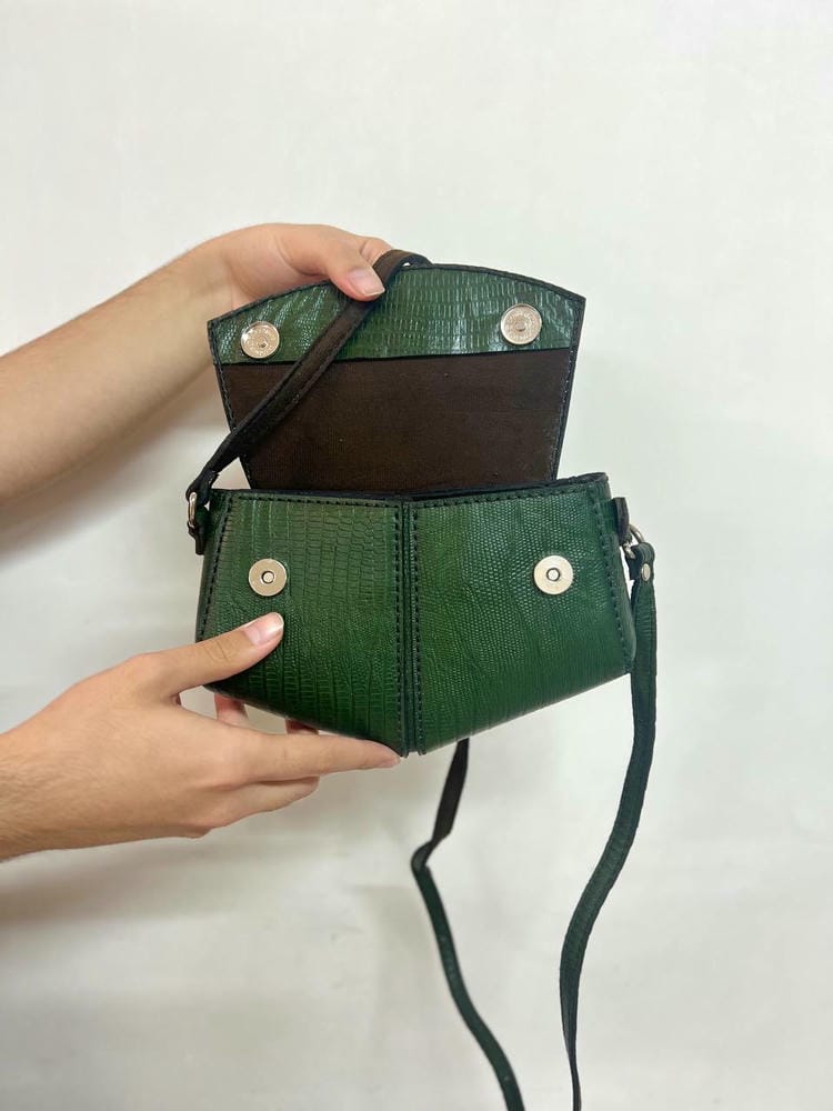 بند چرمی دوشی داره که پشتش آستر خورده ،کیف با درب دکمه خورد باز و بسته میشه و داخلشم آستر دوزی شده.
