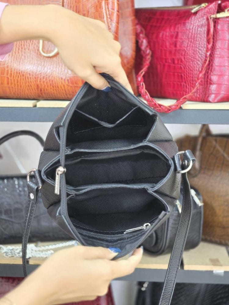 داخل کیف سه طبله هست(سه قسمت مجزا دارد)،یک جیب زیپ دار داخل طبله کناره کیف تعبیه شده و یک قسمت مجزا چرمی هم در طبله کناره ی دیگه کیف تعبیه شده.