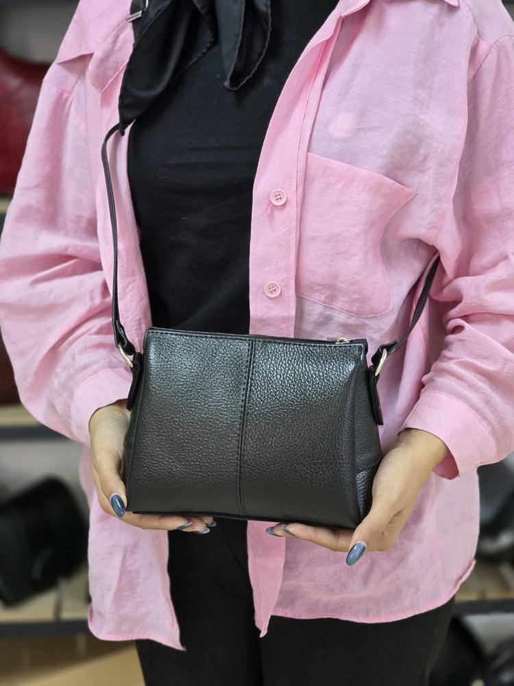 کیف دو طرفه هستش و بند چرمی دوشی دورو داره ،کیف با زیپ باز و بسته میشه و داخلشم برای زیبایی آستر پارچه ای دوخته شده.