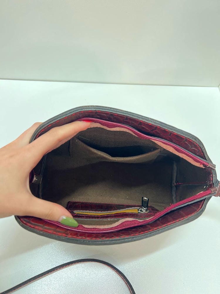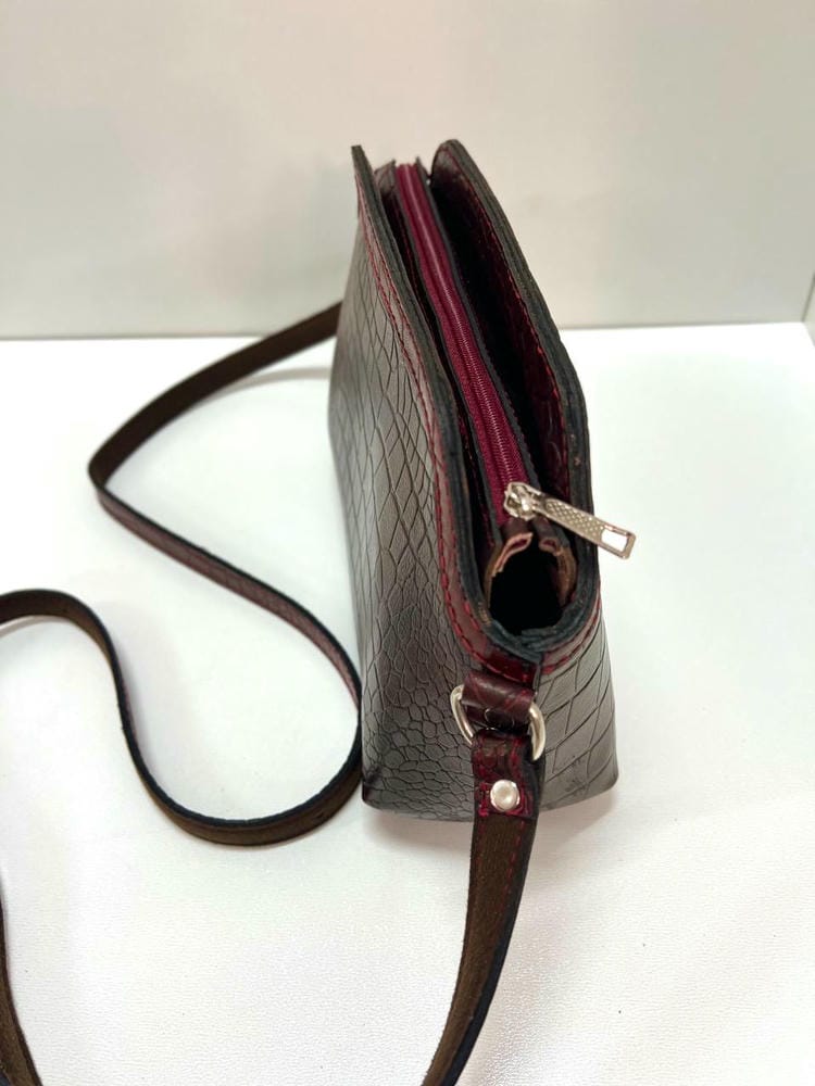 دور دوزی کیف با دست هست و دهانه کیف با زیپ باز و بسته میشه.