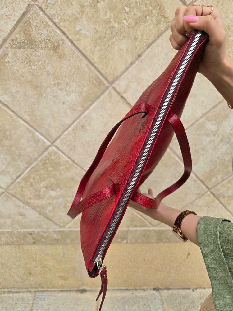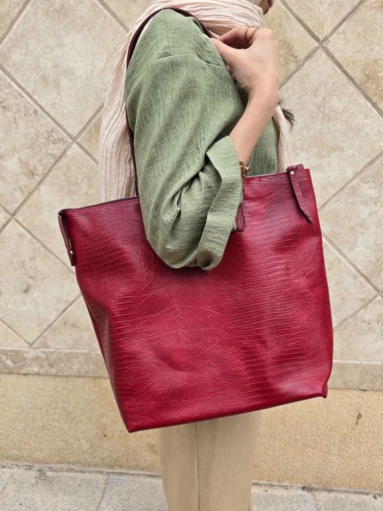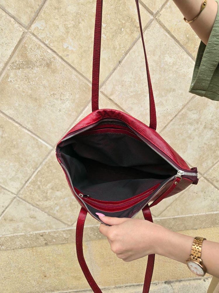 بندش تمام چرمه و داخل کیف آستر دوزی شده ،کیف با زیپ فلزی باز و بسته میشه ،کیف دو طرفه هست و خیلی جادار و سبکه و حالت لخت مانند داره.داخل کیف دو جیب مجزا تعبیه شده.
