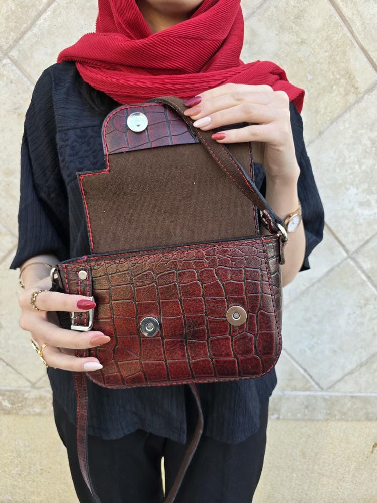 کیف تماما دست دوزه و بند دوشی چرمی داره که پشتش آستر خورده ،کیف با درب مگنت دار باز و بسته میشه و داخل کیف هم آستر دوزی شده.