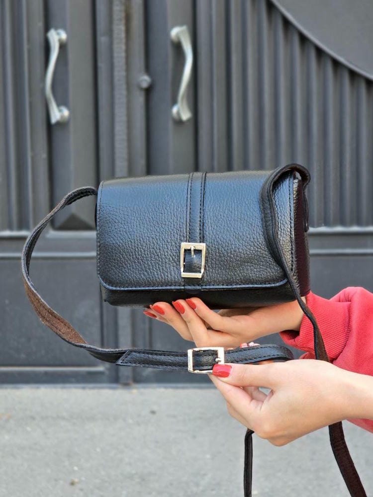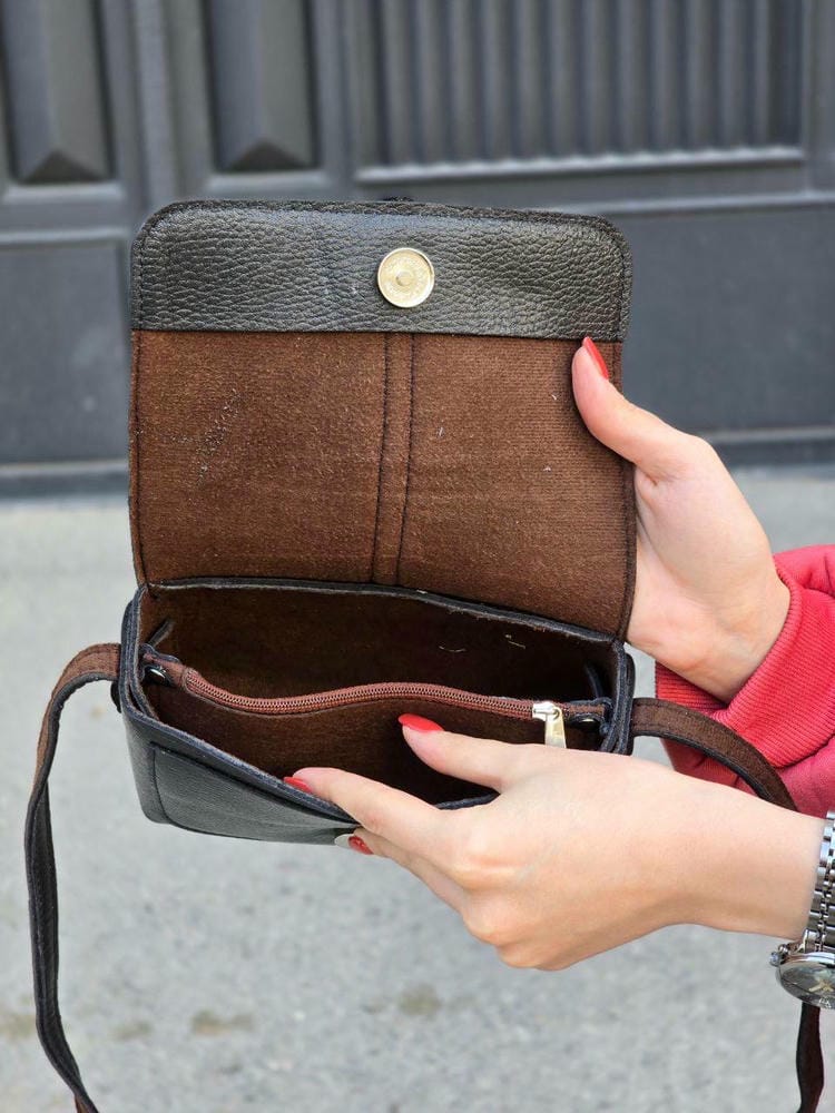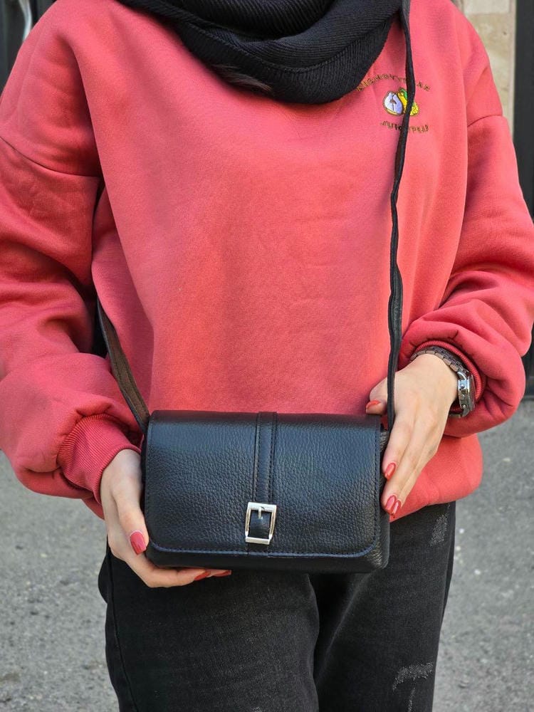 بند دوشی چرمی داره که پشتش آستر خورده ،کیف با درب مگنت دار باز و بسته میشه و داخل کیف هم آستر دوزی شده.