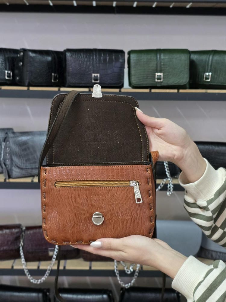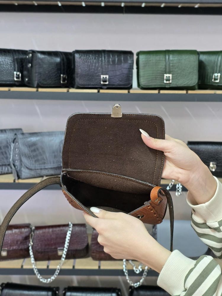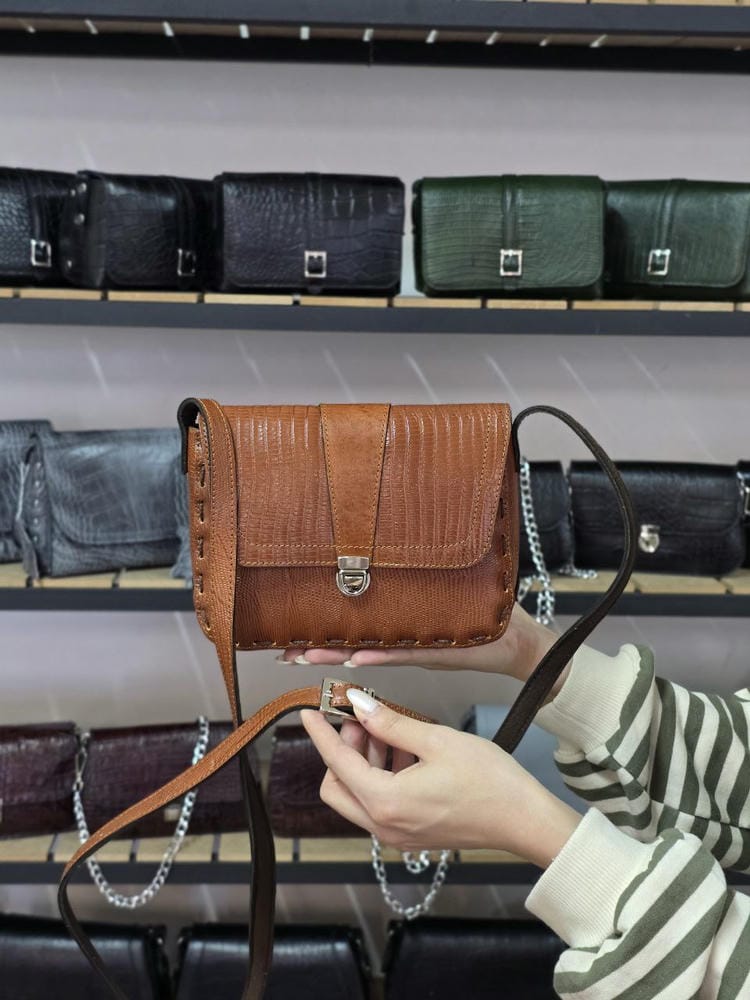 دور دوزی کیف با دست هست و بند چرمی دوشی داره که پشتش آستر خورده ،کیف با درب قفل دار باز و بسته میشه و داخل کیف هم آستر دوزی شده.