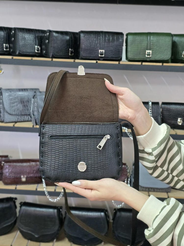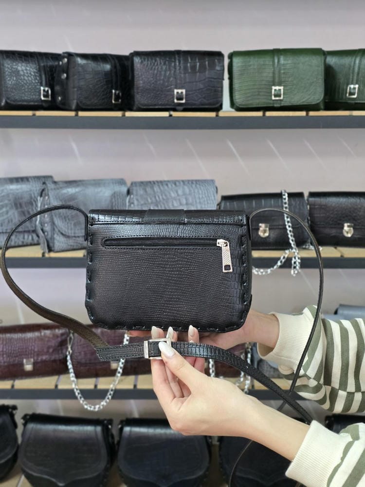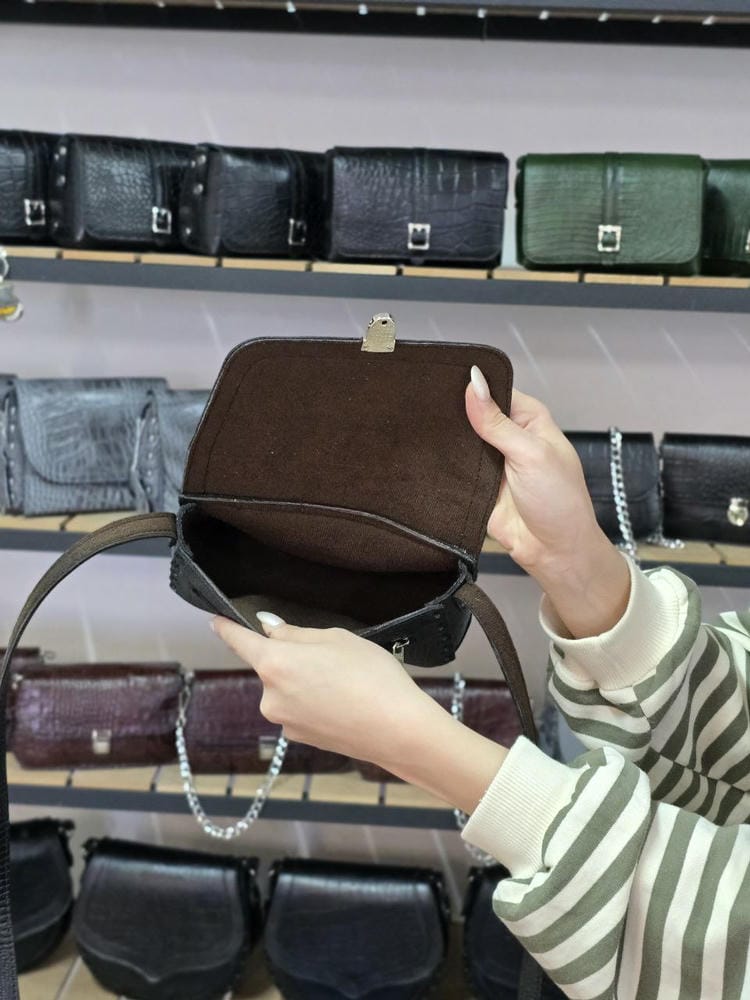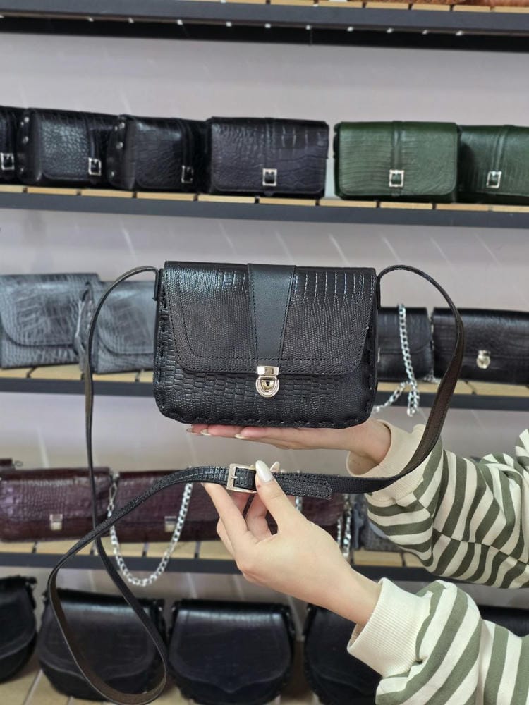 دور دوزی کیف با دست هست و بند چرمی دوشی داره که پشتش آستر خورده ،کیف با درب قفل دار باز و بسته میشه و داخل کیف هم آستر دوزی شده.