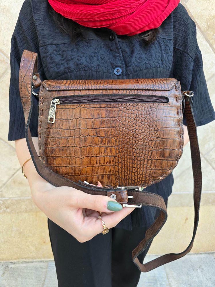 پشت کیف و جلوی کیف هم دارای یک جیب زیپ دار هست. در جلوی کیف یه قسمت جیب دار قرار دارد. دور دوزی کیف دست دوز است.طرح ترنج جلوی کیف به صورت رندوم ارسال می شود.