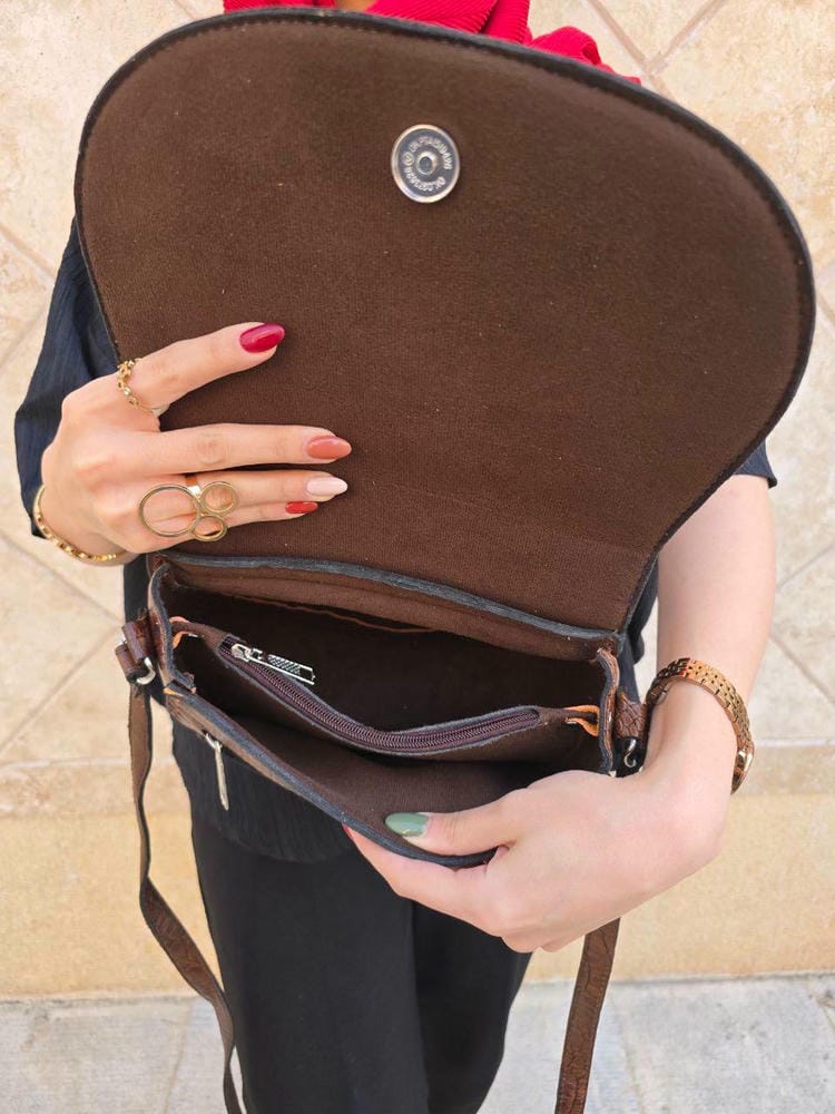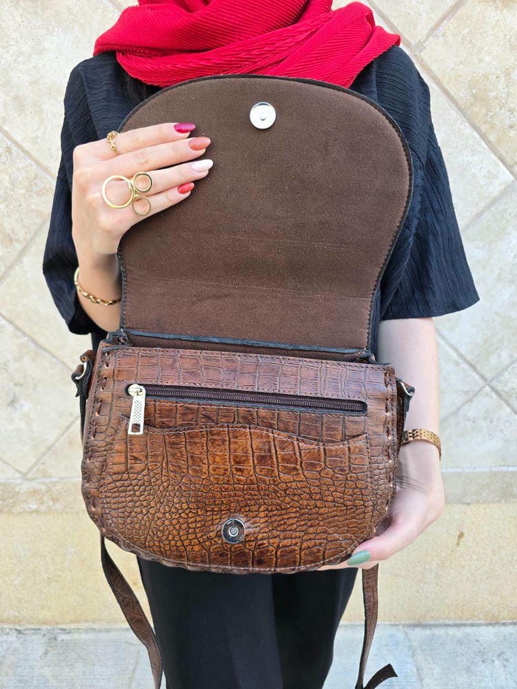 کیف به صورت دوشی قابل استفاده است و پشت بند دوشی و داخل کیف آستر دوزی شده ،کیف با درب دکمه خورد باز و بسته میشه ،داخل کیف دو طبله هستش که با یک جیب زیپی در وسط کیف طبله ها از هم جدا شدن.