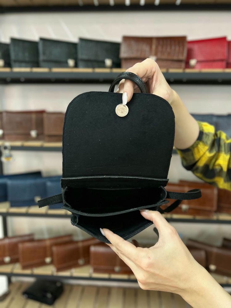 داخل کیف یک قسمت مجزا داره که یه  قسمت دیواره آن جای کارت تعبیه شده.جلوی کیف یک جیب مجزا داره و پشت کیف هم یک جیب زیپ  دار تعبیه شده است .دور دوزی کیف با دست انجام شده است.